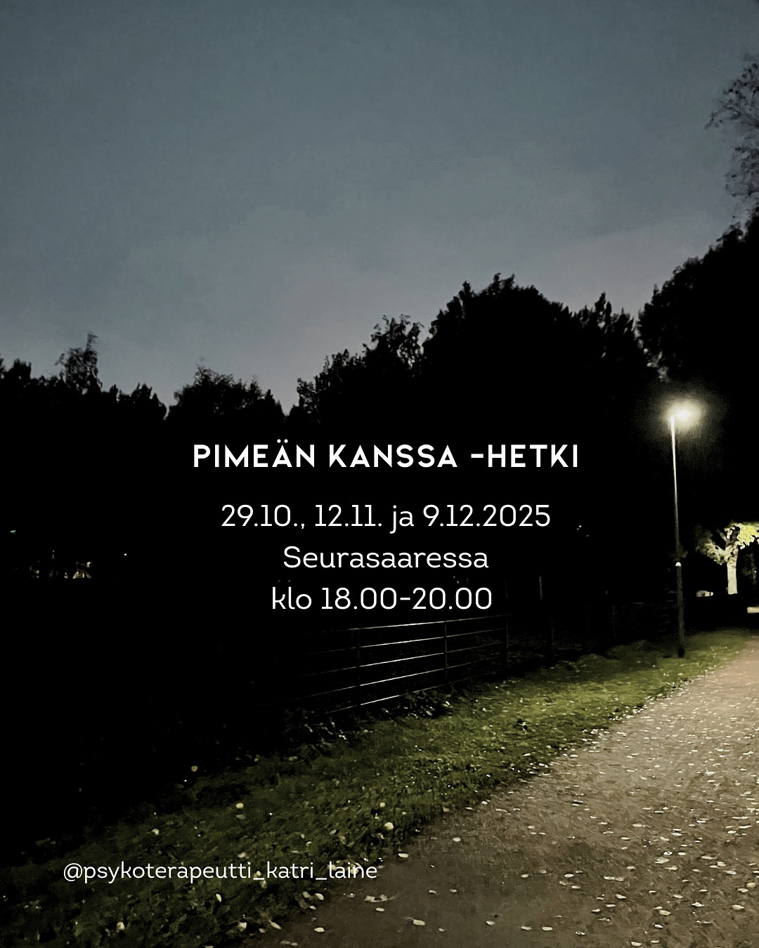 Pimeys voi pelottaa. Kaamosmasennus ja yhä aiemmin hämärtyvien iltojen mukanaan tuoma alakulo ovat tuttuja useille. Toisaalta pimeys voi tuntua lohdulliselta ja turvalliselta, vaipalta johon kääriytyä. Pimeä antaa mahdollisuuden nähdä sen, minkä päivä peittää: tähdet ja ympäröivän universumin, ja ehkäpä oman syvän sisimmän monien sosiaalisten roolien alla.