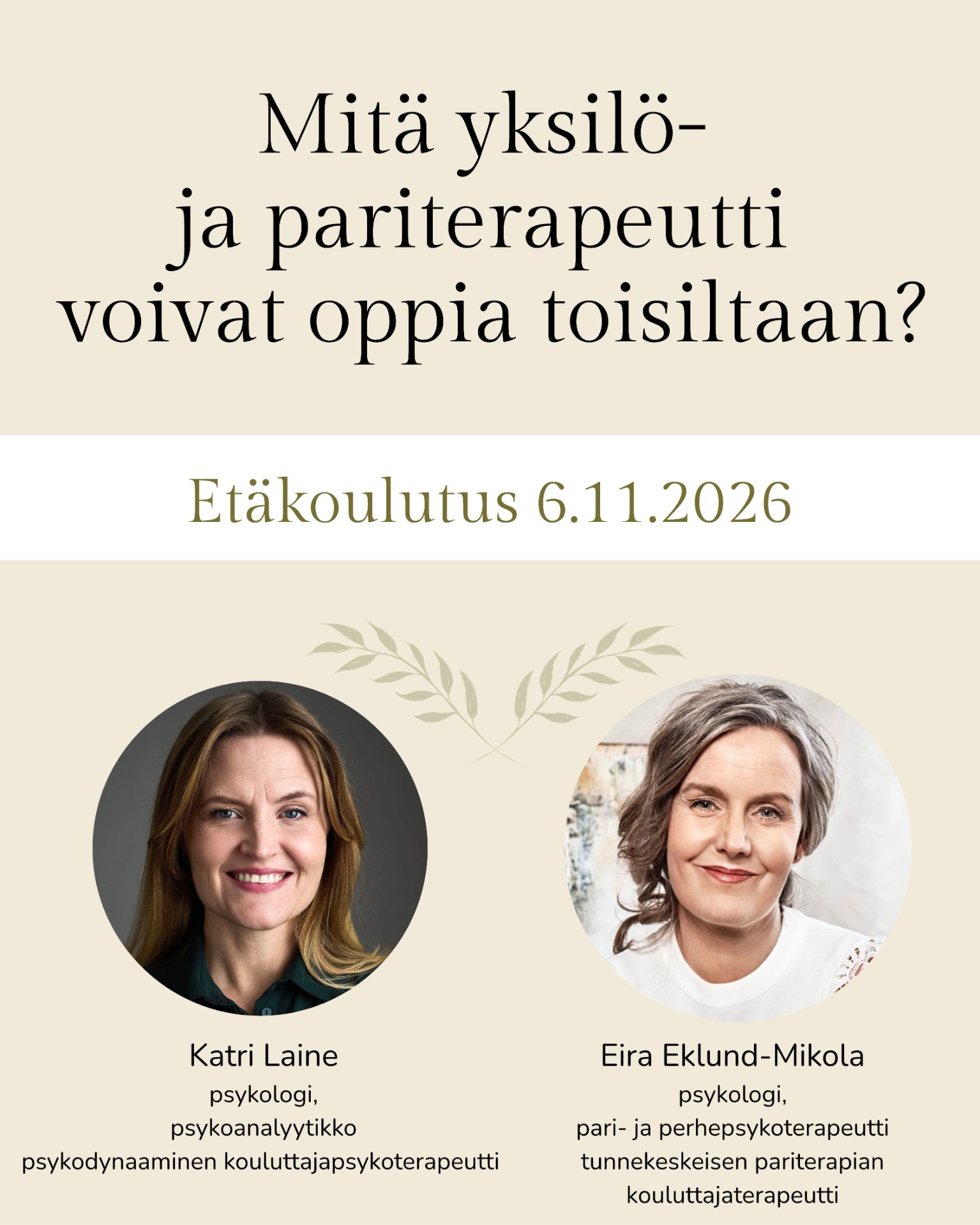 Kouluttajina toimivat tunnekeskeisen paripsykoterapian kouluttajapsykoterapeutti Eira Eklund-Mikola ja psykodynaamisen yksilöpsykoterapian kouluttajapsykoterapeutti Katri Laine.